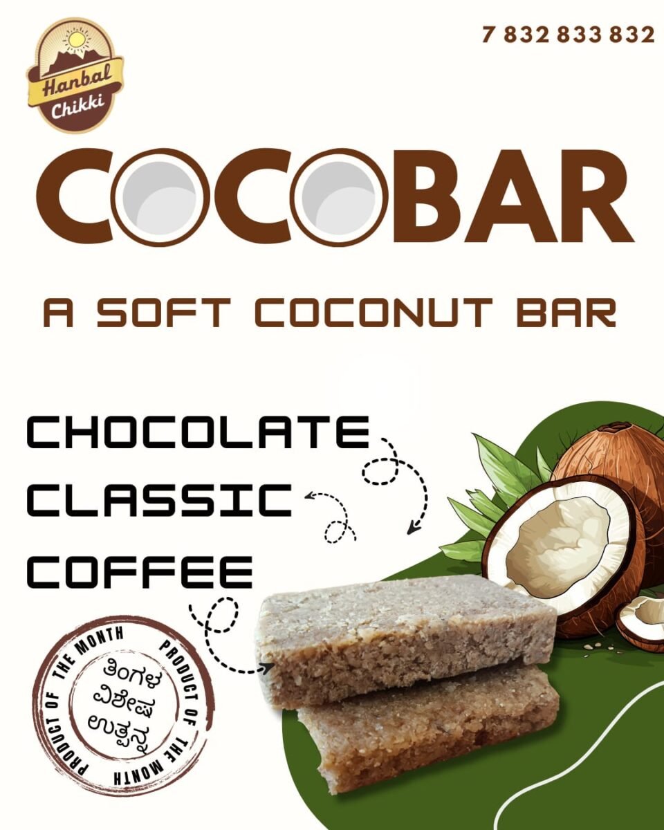 ಕಡಲೇ ಬೀಜದ ಕ್ಲಾಸಿಕ್ ಚಿಕ್ಕಿ, ಹಣ್ಣು – ಸ್ಪೈಸ್ ಗಳ ರುಚಿಯ ಕಡಲೆ ಬೀಜದ ಚಿಕ್ಕಿ, ಡ್ರೈ ಫ್ರೂಟ್ ಗಳ ಚಿಕ್ಕಿ, ಸ್ಪೆಷಲ್ ಚಿಕ್ಕಿ ಇತ್ಯಾದಿ ಚಿಕ್ಕಿಗಳ ಹೊಸತನದ ರುಚಿಗಳ ಅನ್ವೇಷಕ ಸಂಸ್ಥೆ ಸಕಲೇಶಪುರದ ಹಾನ್ ಬಾಳ್ ಚಿಕ್ಕಿಯ ಹೊಸ ಅನ್ವೇಷಣೆ “ಕೋಕೋ ಬಾರ್”. ತೆಂಗಿನಕಾಯಿ (ಕೊಕೊನಟ್ ) ಮತ್ತು ಬೆಲ್ಲದಿಂದ ತಯಾರಿಸಿದ ರುಚಿಕರವಾದ ಸ್ನ್ಯಾಕ್.